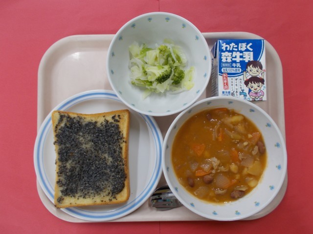 今日は、ブロッコリーサラダが出ます。ここでクイズです。ブロッコリーのつぶつぶした濃い緑色の部分は、何でしょう。1、葉っぱ 2、種 3、花のつぼみ…正解は、3です。このつぶつぶしたつぼみが開くと、黄色い小さな花がたくさん咲きます。Yomokka!で『やさいのはな なんのはな?』を読むと、どんな花か見ることができるので、気になる人は読んでみましょう。私たちは、花が咲く前の硬いつぼみの時期のブロッコリーを食べています。ブロッコリーは、一年中お店に置いてありますが、寒い時期に甘味が増すため、11月から3月ごろが旬といわれています。