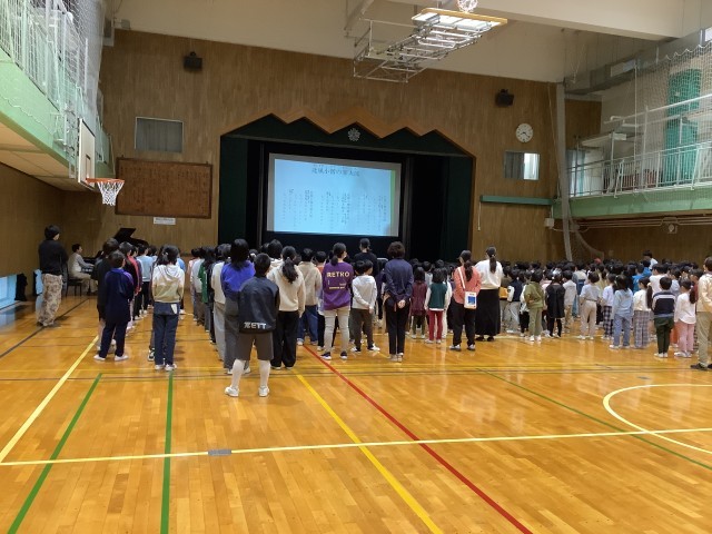 今日は、音楽朝会がありました。全校児童で「北風小僧の寒太郎」を歌いました。