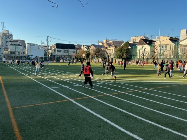 今日は児童集会があり、全校児童で「逆線鬼」というゲームをしました。ルールは、まず逃走者が校庭に描いてある線上を走ります。鬼は、線以外を歩きます。捕まったら捕まったゾーンに行くゲームです。制限時間4分で、2分経ったら全員復活します。皆楽しそうに取り組んでいました。
