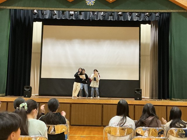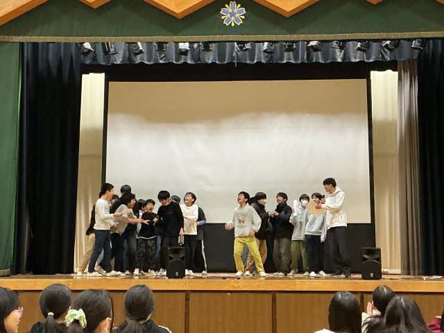カラオケ大会」を体育館で行いました。グループをつくり、歌いたい曲を熱唱してみんなで審査をしました。聴いている人も手拍子で盛り上げ、楽しい時間を過ごすことができました。