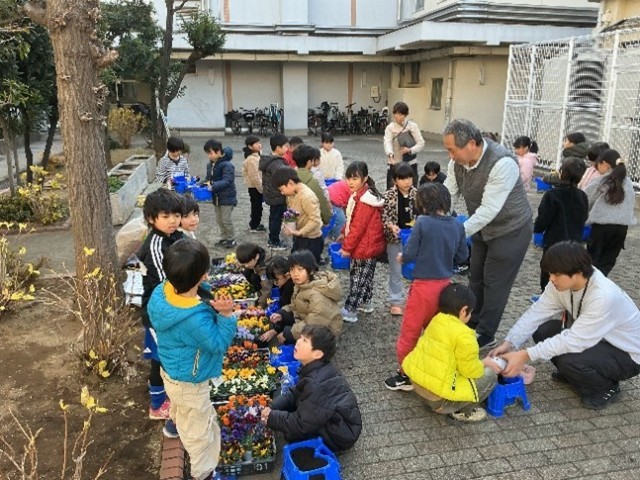 生活科「はなをそだてよう」では、夏の花のあさがおの次に冬の花であるビオラを育てる活動に移りました。1月15日(木)には、五本木小学校商店街にあるフラワーショップ木野花の原田様をお呼びして、土の分量や、苗の植え方、水をあげる頻度などを教えてくださりました。「きれいな色をしている。」や「花びらがかわいいな。」などの発言が多くあり、親しみをもって育てていこうとする姿勢が見られました。また、元気に育てるためにどうすればいいかなど、積極的に質問する姿も見られ、花を大切にしたいという気持ちが高まりました。