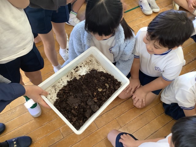普段は、掃除をするときに捨ててしまう落ち葉を、囲いに集めておき、米ぬかや油粕を加えて時々混ぜると、半年くらいで腐葉土となります。栄養のある土ができるだけでなく、虫たちの住処ともなり、環境に良いことを学びました。実際に落ち葉からできた土を見せてもらったときには、「見たい見たい!」や「虫がいる!」、「落ち葉だ!」など興味をもっていることが伺えました。