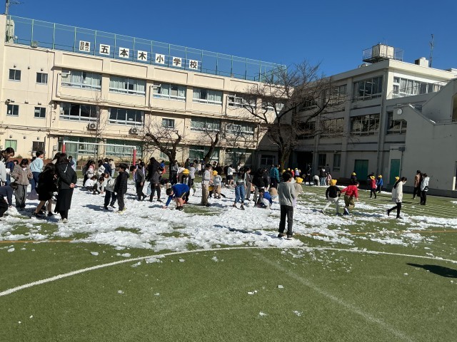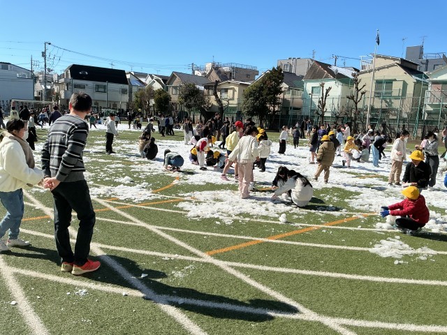 2月7日(土)に住区の雪遊びがあり、新潟からトラックで運んできた雪を校庭に運び、皆で遊びました。その時の雪と、週末に降った雪がまだ溶けなかったので、2月9日(月)健スポタイムの時間に、皆で雪遊びをしました。