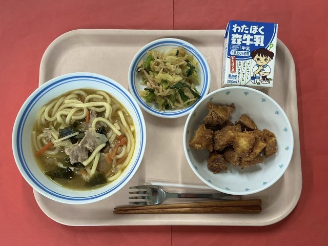 今日はリクエスト給食主食部門3位になった『うどん』が出ます。