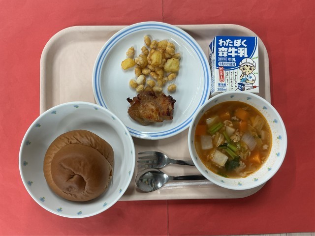 今日の給食では、大豆 とじゃが芋 でカリカリ揚 げを作 りました。もりもり食 べて今日も元気にすごしましょう。