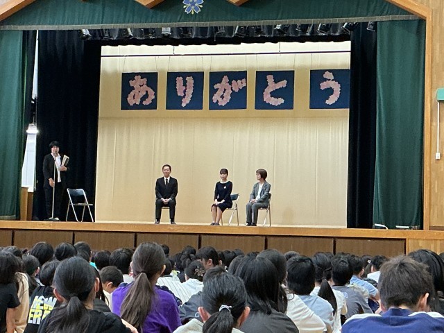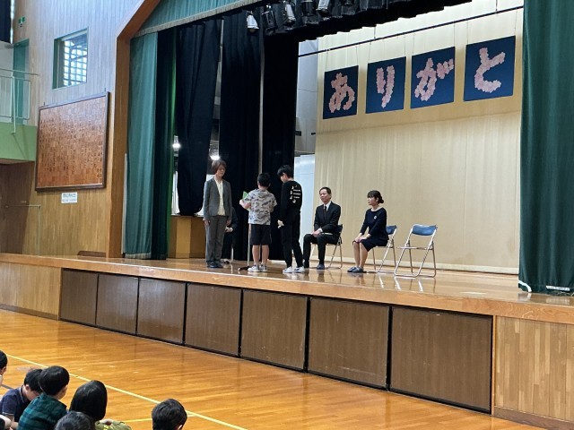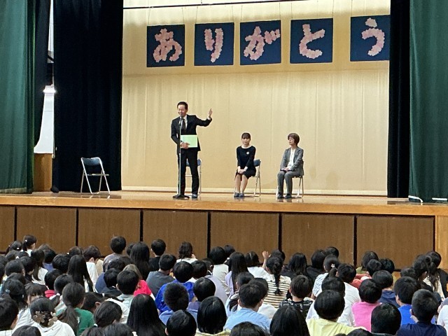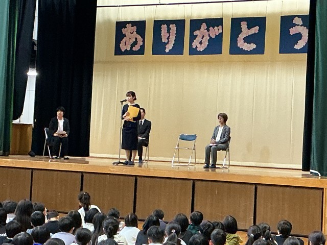 本日は離任式がありました。子どもたちから異動した教職員へ感謝の手紙読んだり、異動した教職員からお話をいただいたりしました。大人も子どもも寂しい気持ちもありますが、久しぶりの再会に笑顔が溢れていました。