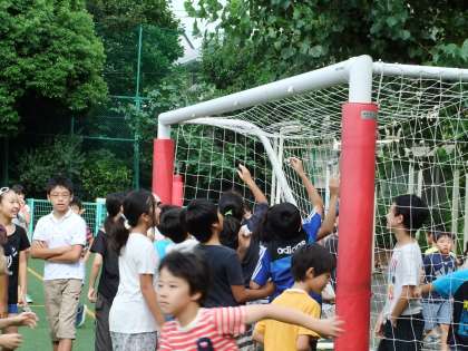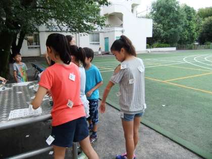今朝は、集会委員会による宝探し集会です。校庭のあちらこちらに点数入りの宝の紙が貼られています。集会委員の子や先生にも貼られています。スタートの合図で、五本木小学生が一斉に宝を探しに行きます。クラスごとに宝の得点を集計して、順位が決まります。