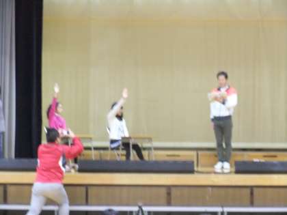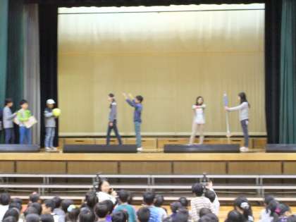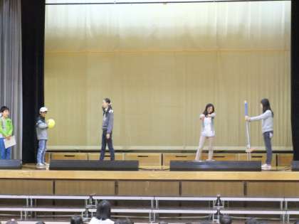 今朝は集会委員会が担当しました。「どこがちがうでしょう」というクイズです。2枚の絵を見比べて違いを探すクイズの劇場版です。まず、1つめの場面を見ます。すぐに幕を閉じてしまうので、その場面をよく覚えておかなければなりません。そして、もう一度幕が開き、2つめの場面です。1つめの場面とどこが違うのか見つけます。この写真は、人数がちがうことが分かります。(左の2枚)途中からは先生も登場。大いに盛り上がりました。