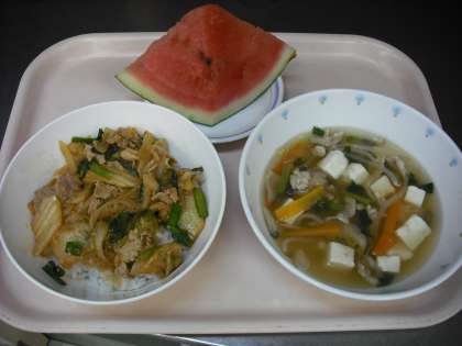 今日の献立は、豚キムチ丼・豆腐入り春雨スープ・くだもの(すいか)・牛乳です。