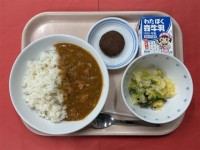 今日の献立は、胚芽パン・チキンバーベキューソース・コーンポテト・千切り野菜のスープ・くだもの(梨)・牛乳です。