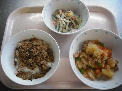 今日の献立は、麦ご飯・おからとひじきのふりかけ・肉じゃが・ごぼうサラダ・牛乳です。