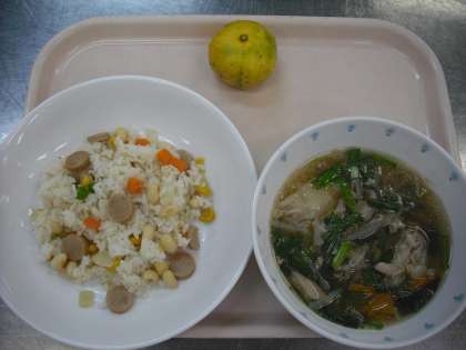 今日の献立は、大豆ピラフ・肉入りワンタンスープ・くだもの(みかん)・牛乳です。