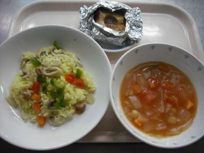 今日の献立は、パエリア・ひよこ豆のスープ・焼きリンゴ・牛乳です。