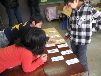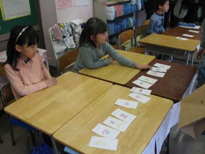 まとめることば「くだもの」の中に、一つ一つのことば「みかん」「りんご」「いちご」などがあることを学び、その学習を生かして、自分のやりたいお店で品物(カード)を売りました。