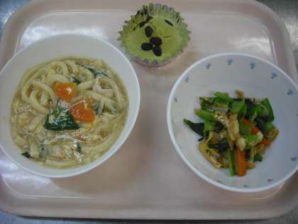 今日の献立は、親子とじうどん・野菜のおひたし・抹茶の米粉カップケーキ・牛乳です。