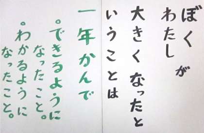 できるようになったこと、分かるようになったことを思い出してみましょう。思い出せない人がいたら、おうちの人や先生に聞いてみましょう。きっと教えてくれるはずです。そして、できるようになったことには、大いに自信をもってください。