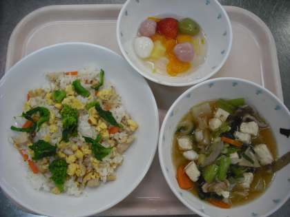 今日の献立は、菜の花寿司・けんちん汁・ひなまつりポンチ・牛乳でした。