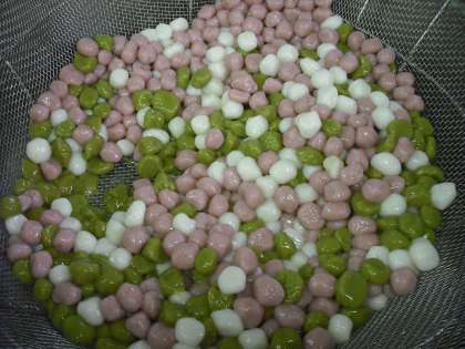 緑色の白玉には抹茶、ピンク色にはいちごを入れて色づけました。