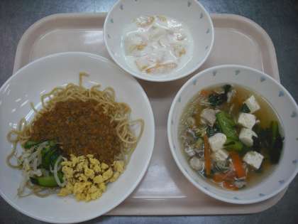 今日の献立は、ジャージャーめん・春雨スープ・フルーツヨーグルト・牛乳です。