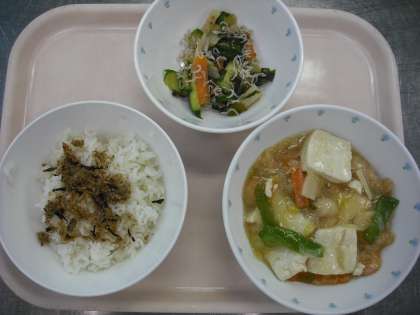 今日の献立は、むぎごはん・おからひじきふりかけ・えびと豆腐のうま煮・じゃこ入り和風サラダ・牛乳です。