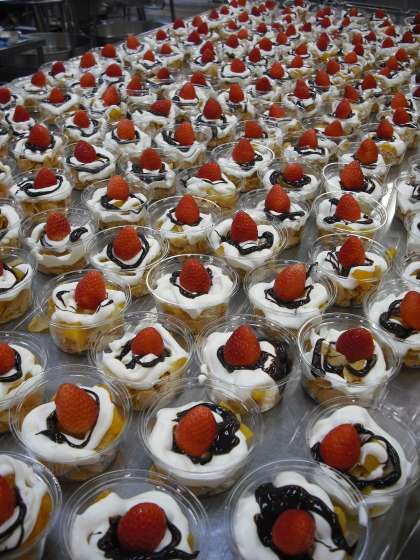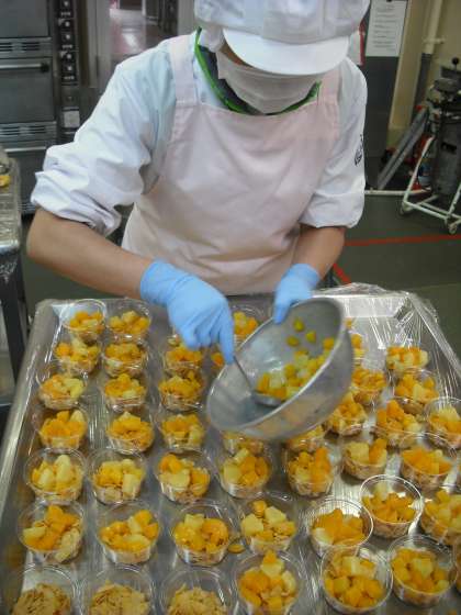たてわり班で6年生の卒業を祝うので、給食室ではお祝いの気持ちを込めてミニパフェを作りました。