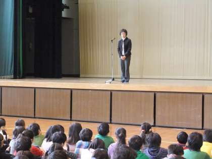 今朝の全校朝会では、人権標語の表彰がありました。6年生代表児童の標語が区長賞を受賞しました。表彰の後、目黒区の人権擁護委員の先生から、お互いの人権を守るとはどのようなことなのかお話がありました。区長賞を受賞した人権標語です。「人権は 尊重するもの 守るもの みんながもってる 心の支え」