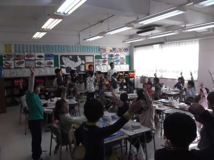 ↑「和食マンのこと待ってた人〜?」に、元気に答える一年生。