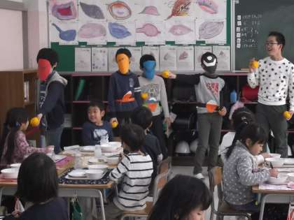 5年生が和食の魅力を発信中の今月、早くも1年生の教室では「今日は和食だから、和食マンが来るよね?来なきゃ変だ」との声があがっていました。その中で、登場した和食マンに、大盛り上がりでした。「今日の鯖、食べたらいい香りしなかった?それ、何が入ってるか知ってる〜?」と、本当に上手に柚子をPRしていました。苦手だったはずの柚子が、いっぺんに人気に変わった瞬間でした。子ども同士の働きかけの影響力に、感動させてもらった時間でした。