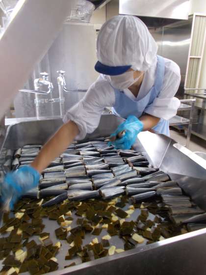↑昆布と生姜の上に秋刀魚を並べて煮ます。