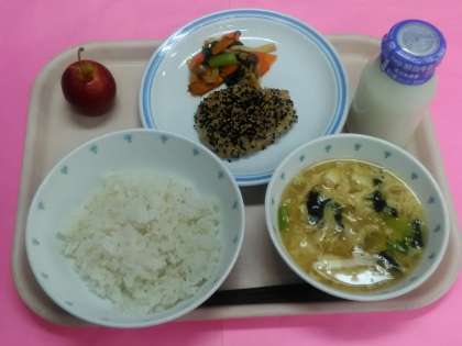 今日の果物は、アルプス乙女という種類の姫りんごです。姫りんごはなかなか手に入らないので、食べる機会は少ないと思います。味は通常のりんごのようなみずみずしい甘みはありませんが、さっぱりとしていて、なによりもその小ささがかわいらしいりんごです。「丸ごと食べる」というのが楽しくて子ども達ははしゃいでいました。
