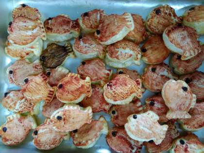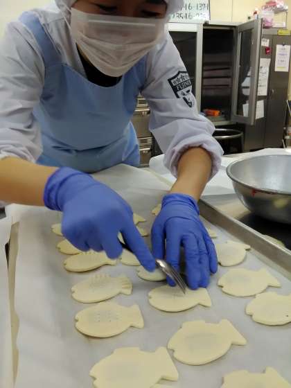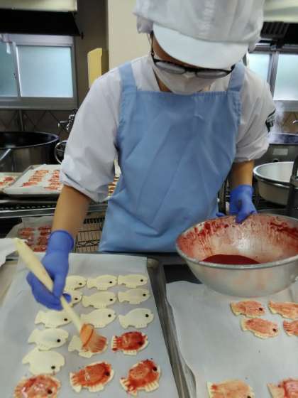 ↑パイを伸ばして、魚の型で抜いて、チョコチップで目を付けて、フォークで空気抜き。