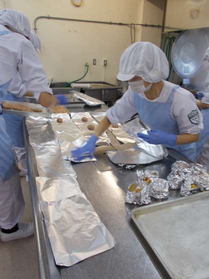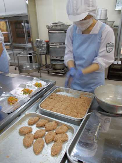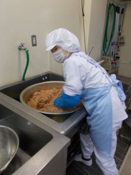 ↑ひき肉と、茹でて刻んだ大豆(増量のため)と、飴色に炒めた玉葱と調味料を合わせて、よく練ります。この練りが甘いと、肉汁が流れ出てしまうので、とっても大事です。それにしても、冬には冷たさで手が痛い。。。でも、笑顔が出るのがすごい!