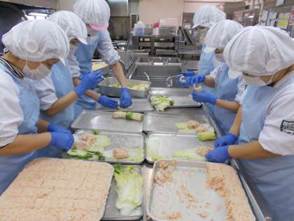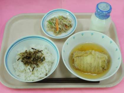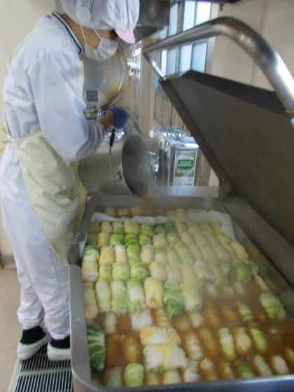 今日の主菜は、肉団子の白菜包みを作りました。和風のロールキャベツのようなイメージです。タネには、豆腐やおからを入れてヘルシーに仕上げたのですが、昆布だしをしっかりと吸ってジューシーにできました。やや白菜のスジが強いものに苦戦している子もいましたが、口に合ったようで人気でした☆