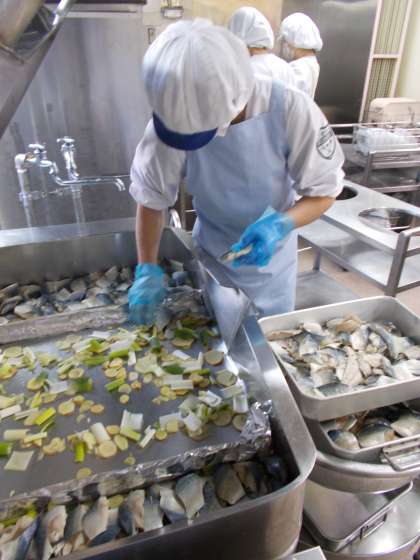 ↑葱と生姜を鍋底に敷いて、鯖を並べていきます。