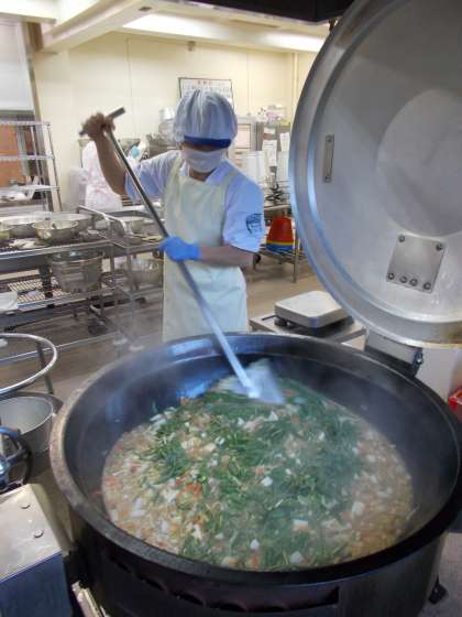 ↑ただ煮込むと言っても、大きな鉄釜の中で「食感を残しつつ間違いなく火を通す」というのは、なかなか難しいのです。でも、さすが調理員さん、今日も美味しくできました。