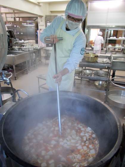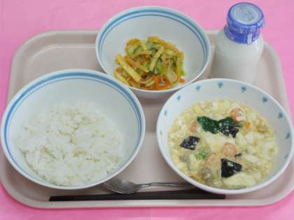 今日は、豆腐がメインの給食です。豆腐は、「良質なたんぱく質」を含むとして栄養学の中では当たり前に言われます。でも、なかなか日常生活では魚が無くては、肉が無くてはと、思いがちの様です。少しの肉類でも、大豆製品を多く使う時には十分たんぱく質を摂ることができます。麻婆豆腐などの豆腐料理もそうですね。ぜひ、日常の食卓に積極的に使ってみてください。