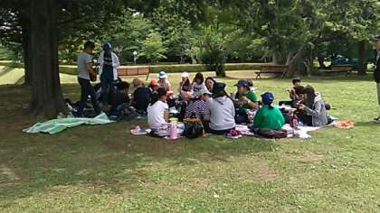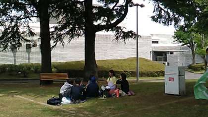 途中、事故渋滞に巻き込まれましたが、歴史民俗博物館に到着し、まずは昼食です。おにぎりと唐揚げの弁当を広々とした芝生で食べました。