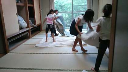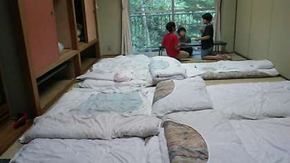 予定通り、宿舎に到着しました。着いた直後は浮かれている声も聞かれましたが、たちまち落ち着いた五年生です。すぐ布団まで敷いてしまいました。避難訓練も立派でした。