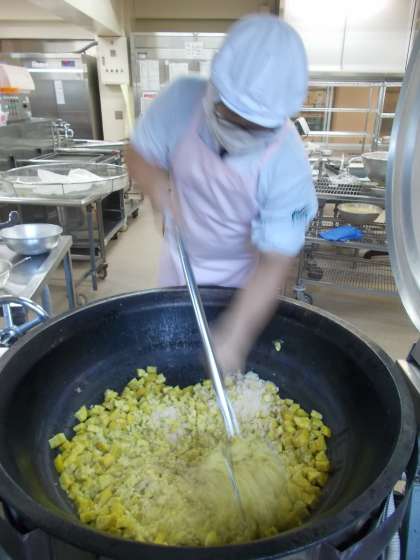 ↑アツアツのさつま芋を大きなマッシャーでつぶします。