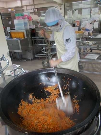 今日は、新作の焼肉金平バーガーでした。バーガーというよりもサンド?という仕上がりですが、低学年にも食べやすいのはコッペパン型だと先生方の案でこの形になりました。なかなか野菜たっぷりのパンというのが少なかったので心配でしたが、どの学年もよく食べていました。