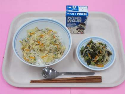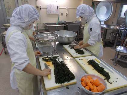 ↑わかめ漁師さんと、給食に最適なわかめを選び抜いたところ、肉厚のわかめに決定!とてもおいしくなりました!