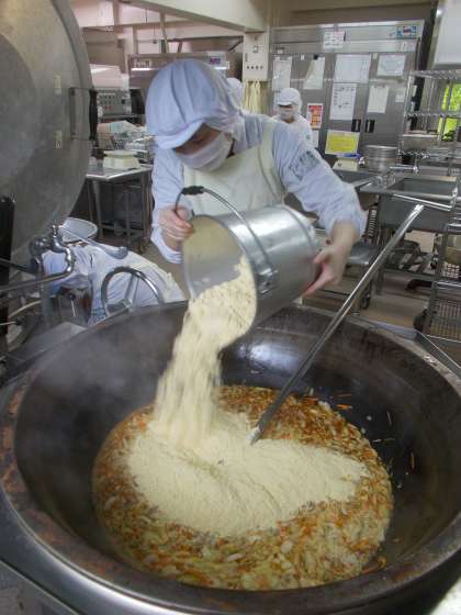 ↑とふの粉は、高野豆腐の粉です。汁を多めにして作った煮物に加えて煮ると、フワフワジューシーになりました。