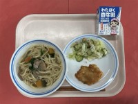 牛乳和風ツナスパゲッティポテトのパリパリサラダ果物 (柿)ベーコン(スペイン・国...