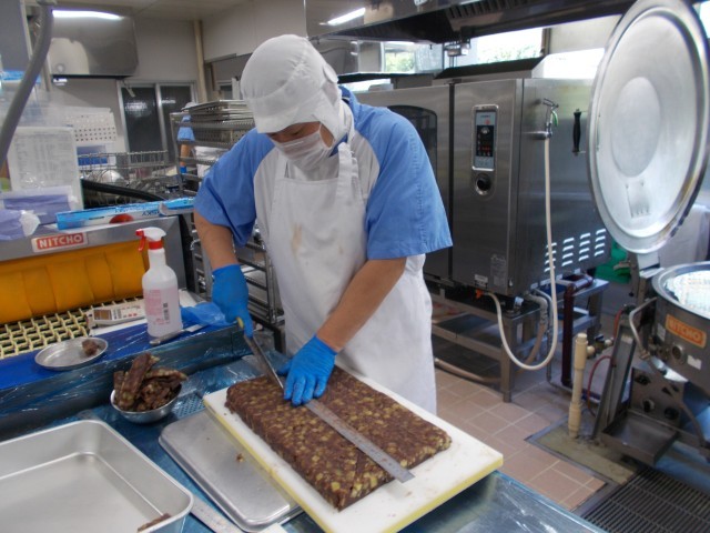 今日はサツマイモを使って蒸しようかんを作りました。水ようかんは7月に給食でも提供しましたが、蒸しようかんははじめてです。こしあんに小麦粉とでん粉、水を入れ、蒸しているのでもっちりとした食感です。とてもおいしくでき、あんこが好きな子には好評でしたが、苦手な子はなかなか箸が進まない様子でした。