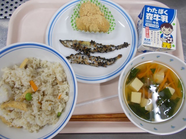 10月6日 さといもとしめじのご飯 すまし汁 シシャモのゴマ焼き かぼちゃ月見団子 牛乳