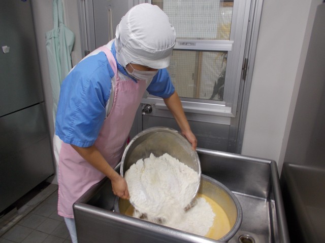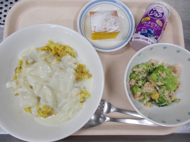 今日は目の愛護デーなので、目に良いと言われる食べ物をたくさんつかったメニューにしました。カレーピラフにはみじん切りにしたニンジンを入れました。ホワイトソースをかけたので、まろやかでおいしくなりました。サラダにはブロッコリーと枝豆、ひよこ豆、ツナを入れました。ケーキには、ゆでてピューレ上にしたニンジンを入れました。ふわふわでおいしいケーキになりました。