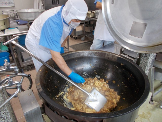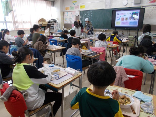 今日は宮城県の郷土料理である油麩丼とおくずかけを作りました。油麩丼は宮城の旅館の女将さんが考えたメニューで、かつ丼のかつの代わりに油麩を使って作ったものです。油麩が出し汁を吸っておいしくできましたが、子どもたちからは「食感が苦手」「肉が良い」という声もありました。おくずかけは、白石温麺をいれた具沢山の汁物です。今日はそうめんを入れました。くだものは旬のミカンで、寒くなってきたこともあり、甘みが出てきました。