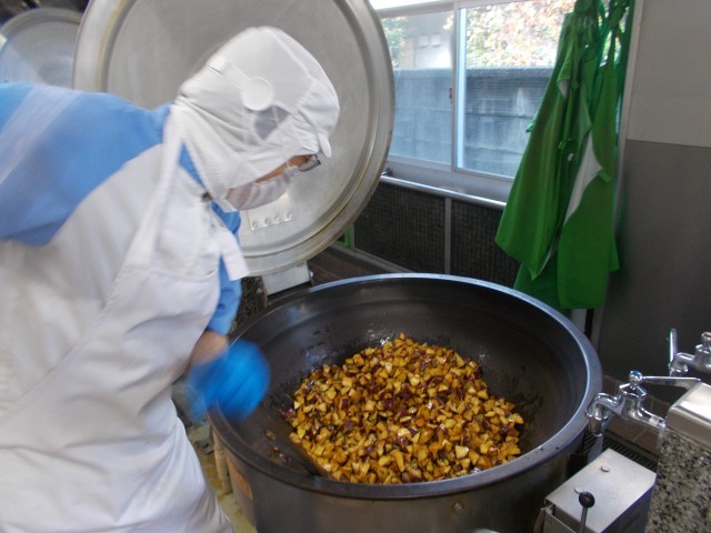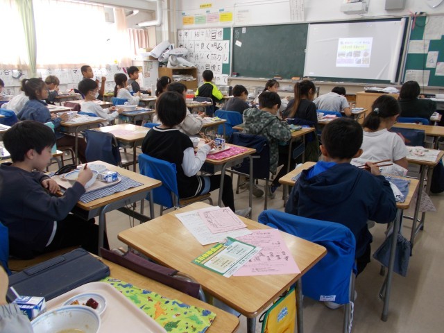 今日は甘藷祭りに合わせて、サツマイモを使って大学芋を作りました。さつまいもの普及に努めた青木昆陽さんのお墓が目黒不動尊にあることから、毎年10月28日に甘藷祭りが開かれています。子どもたちには目黒区にゆかりのある食べ物の一つとしてさつまいもの動画を見てもらいました。大学芋は油で揚げてから特製のみつを絡めました。ボリュームがありましたが、大学芋は大好きという子が多く、よく食べてくれていました。豆乳タンタンうどんは、ピリッとした辛さの中に豆乳と練りごまのまろやかさがあり、とてもおいしくできました。
