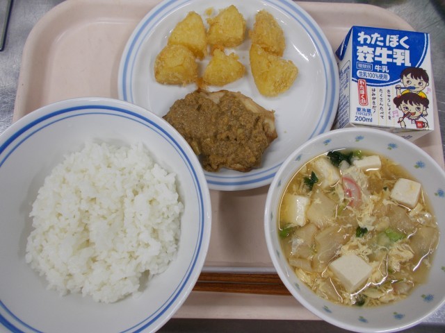 11月6日 ごはん かんぴょうの卵とじ汁 もろのネギみそ焼き いもフライ 牛乳
