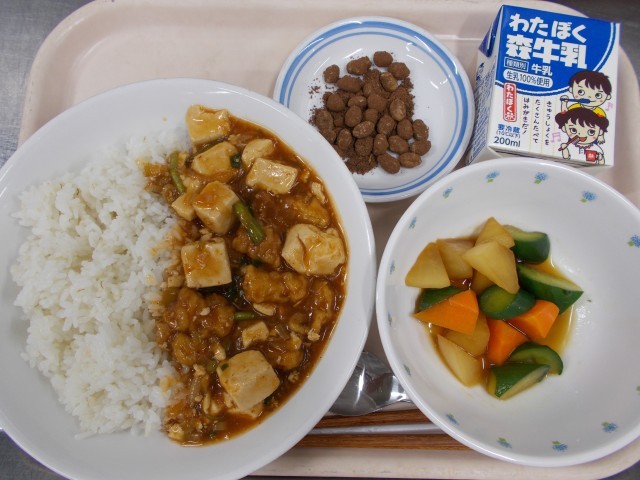11月7日 ごはん 豆腐とイカのチリソース 中華風野菜 ココア大豆 牛乳